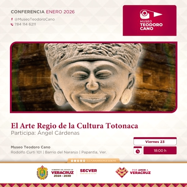 Xalapa, Ver., 20 Enero 2026.- La Secretaría de Cultura de Veracruz (Secver) invita al público en general a participar en la conferencia El Arte Regio de la Cultura Totonaca, el próximo viernes 23 de enero, a las 18:00 horas, en las instalaciones del Museo Teodoro Cano, de Papantla. La entrada es libre. Se trata de un diálogo que busca difundir el conocimiento histórico, simbólico y cultural … Continúa leyendo ‘Arte regio de la cultura totonaca’, en el Museo Teodoro Cano, de Papantla