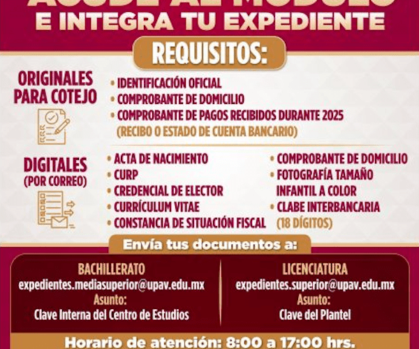 Xalapa, Ver., 04 Febrero 2026.- La Universidad Popular Autónoma de Veracruz (UPAV) informa la apertura de 12 sedes regionales para la integración y validación de expedientes de maestras, maestros, directoras y directores de la UPAV, quienes deberán acudir al módulo que les corresponda de acuerdo con su región. La atención se brindará del jueves 05 al domingo 08 de febrero, en un horario de 08:00 … Continúa leyendo La UPAV apertura sedes para integrar expedientes de docentes y directivos