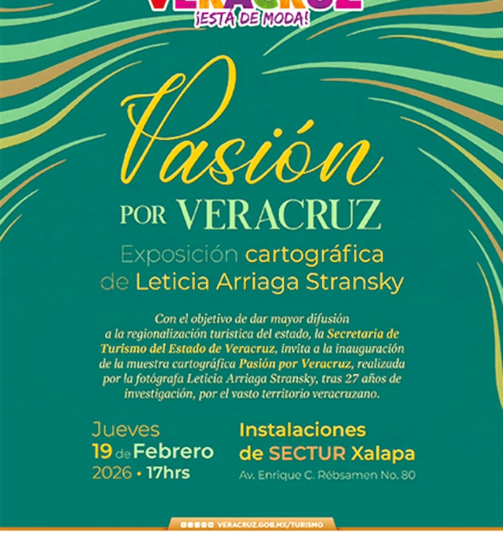 De fotoinvestigadora Leticia Arriaga Xalapa, Ver., 19 Febrero 2026.- La Secretaría de Turismo (Sectur) inaugurará este día, a las 17:00 horas, la exposición cartográfica Pasión por Veracruz, en sus instalaciones ubicadas en Enrique C. Rébsamen número 80, en Xalapa, como parte de una estrategia integral para fortalecer la promoción y el posicionamiento turístico del estado. La muestra, desarrollada en coordinación con la fotógrafa e investigadora Leticia … Continúa leyendo Muestra cartográfica ‘Pasión por Veracruz’, promociona el estado