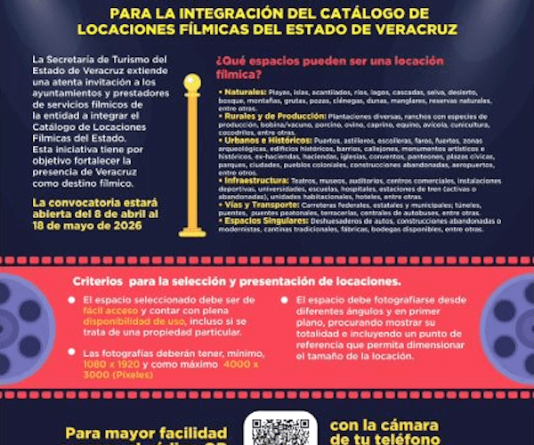 Con Comunas y prestadores de servicios Xalapa, Ver., 14 Abril 2026.- La Secretaría de Turismo convoca a ayuntamientos y prestadores de servicios a integrar el Catálogo de Locaciones Fílmicas del Estado, con el objetivo de proyectar la presencia de la entidad como destino para la industria audiovisual. Podrán registrarse espacios con potencial para producciones cinematográficas, televisivas, publicitarias y de contenido digital. Estos pueden ser naturales, como … Continúa leyendo Catálogo de locaciones fílmicas en la entidad, integrará la Sectur