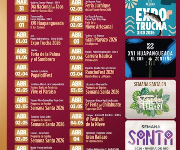 Disfrutalos en Veracruz: Sectur Xalapa, Ver., 31 Marzo 2026.- Con festivales gastronómicos, ferias tradicionales, eventos culturales y deportivos, la Secretaría de Turismo (Sectur) invita a disfrutar de las actividades que se realizarán a partir de hoy y hasta el 05 de abril. Este 31 de marzo, en el malecón de Gutiérrez Zamora, se tiene lugar el Día Nacional del Taco, evento gastronómico que reúne a familias … Continúa leyendo Eventos de gastronomía, artísticos, culturales y deportivos en seis días