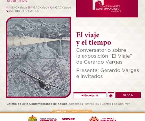 Este miércoles, en la GACX Xalapa, Ver., 14 Abril 2026.- La Secretaría de Cultura de Veracruz (Secver) invita al público en general al conversatorio El viaje y el tiempo, que se realizará este miércoles a las 18:00 horas en la Galería de Arte Contemporáneo de Xalapa (GACX). La entrada es gratuita. Gerardo Vargas, actual expositor en la sala principal del recinto, compartirá con las y los … Continúa leyendo Conversatorio de Gerardo Vargas, técnico académico del IAP de UV