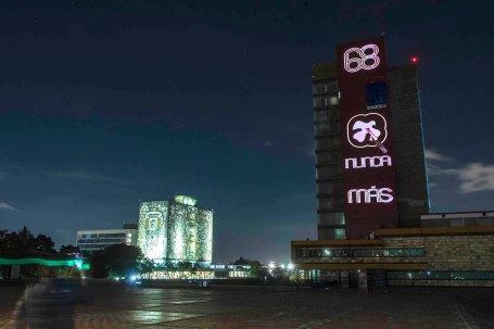 “Nunca más “, dice el mensaje de la UNAM en la pared de la Rectoría, justo debajo de la icónica imagen del 68, y de la paloma de la Paz atravesada por la punta de una bayoneta.