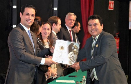 Xalapa, Ver., 24 de octubre de 2018.- La Subdelegación del Seguro Social en Martínez de la Torre, fue galardonada con el distintivo “Águila Oro” Premio IMSS a la Competitividad 2018, el cual fue entregado por el Director General del organismo, Tuffic Miguel Ortega al subdelegado Joaquín Cayetano Lara González.