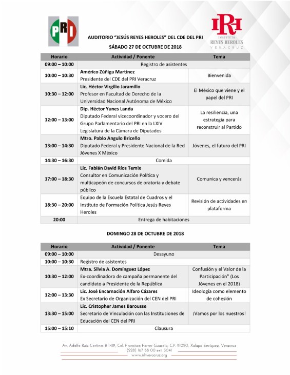 Participarán como ponentes Héctor Virgilio Jaramillo, profesor de la UNAM; Américo Zúñiga Martínez, presidente del CDE del PRI; Héctor Yunes Landa, diputado federal; Pablo Angulo Briceño, presidente nacional de la Red de Jóvenes por México; Adrián Ríos Temix, campeón nacional de concurso de debate.