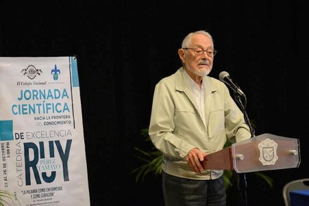 Previo a su charla, Pérez Tamayo expresó su gratitud hacia sus amigos y miembros de El Colegio Nacional así como a las autoridades de la Universidad Veracruzana y a sus amigos como Víctor Alcaraz.