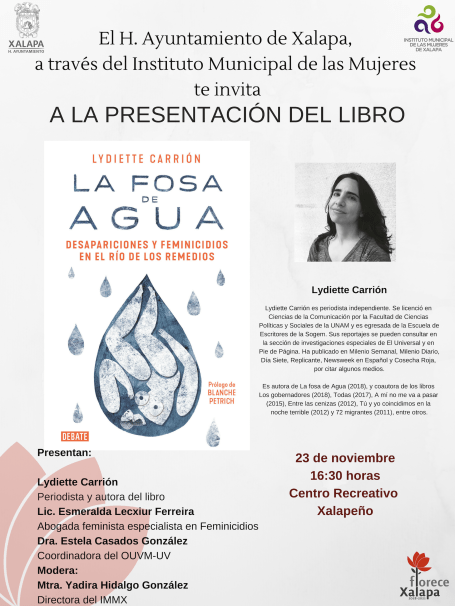 Xalapa, Ver., 19 de noviembre de 2018.- Para sensibilizar a la población y visibilizar la violencia que las mujeres enfrentan, el próximo 23 de noviembre se presentará en el Centro Recreativo Xalapeño el libro La fosa de agua: desapariciones y feminicidios en el Río de los Remedios, de la periodista de investigación Lydiette Carrión, quien utiliza las herramientas de la crónica para narrar las desapariciones de al menos diez adolescentes –todas estudiantes–, en el Estado de México.
