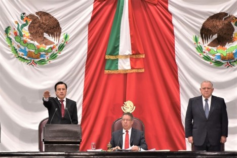 Ante cientos de veracruzanos, de los sectores social y privado, invitados especiales, alcaldes, dirigentes de organizaciones no gubernamentales, en una ceremonia sobria y republicana, juró respetar y hacer cumplir la Constitución General del Estado de Veracruz, como mandato del pueblo que con su votó le otorgó en los comicios del 1 de julio de este 2018, y fijó como sus banderas la austeridad republicana por parte de su gobierno y el combate a la corrupción, pues dijo que no habrá un gobierno rico y un pueblo pobre.