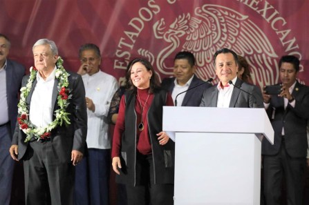 También, reiteró sus compromisos de llevar internet gratuito a todo el estado, a través de las líneas de la CFE, para acercar el servicio hasta las comunidades más apartadas; impulsar la ruta ferrocarrilera transístmica Salina Cruz-Coatzacoalcos, para el desarrollo de esta importante región; modernizar la Refinería de Minatitlán y atender la problemática que existe en el basurero de Las Matas, en los municipios de Minatitlán y Coatzacoalcos.