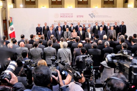 Acompañado de las secretarias del Trabajo y Previsión Social, Luisa María Alcalde, y de Economía, Graciela Márquez Colín, el titular del ejecutivo sostuvo que la Nueva Política de Salarios Mínimos es un acto de madurez política y conciliación que da confianza para las condiciones laborales y sociales de México.