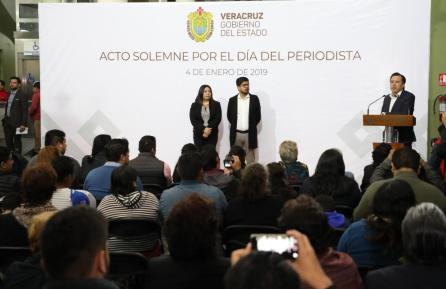 Xalapa, Ver., 04 de enero de 2019.- En el marco del Día del Periodista en México, el gobernador Cuitláhuac García Jiménez aseguró que esta administración emprenderá acciones para evitar cualquier problemática que entorpezca esta labor, al mismo tiempo, se enaltecerá y fomentará siempre la libertad de expresión.