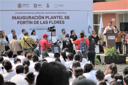 Fortín de la Flores, Ver., 05 de febrero de 2019.- La Secretaría de Educación de Veracruz (SEV), a través del Instituto de Espacios Educativos, inauguró las nuevas instalaciones del plantel 56 del Colegio de Bachilleres del Estado de Veracruz (COBAEV), donde se invirtieron tres millones de pesos del programa federal “Escuelas al Cien”.