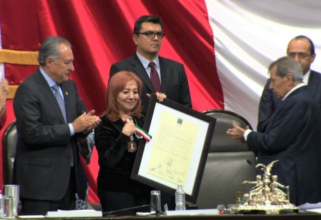 Rosario Piedra Ybarra, hija de la galardonada -quien por cuestiones de salud no pudo asistir- recibió la distinción, el pergamino alusivo al dictamen de la Comisión de Régimen, Reglamentos y Prácticas Parlamentarias, así como el ejemplar original del Decreto de la Cámara de Diputados.