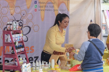 Lourdes Godínez acudió a la Expo-Feria desde San Luis Potosí. Es la sexta generación de apicultores en su familia; el tatarabuelo comenzó en Jalisco, “es un negocio fácil cuando lo traes en la sangre y amas a las abejas. Nosotros estamos enseñándoles a nuestros hijos, que serán ya la séptima generación, es un orgullo”.
