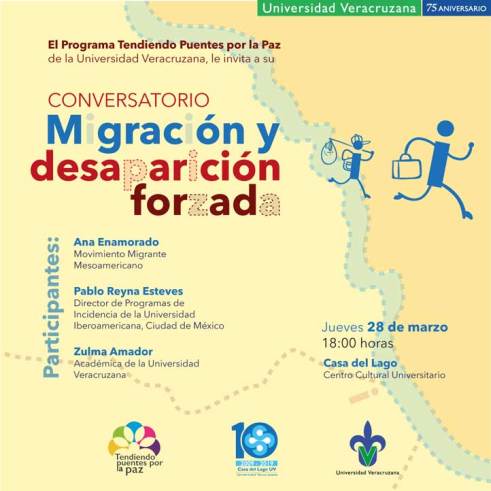 Xalapa, Ver., 27 de marzo de 2019.- El programa “Tendiendo puentes por la paz” de la Universidad Veracruzana (UV) desarrollará el conversatorio “Migración y desaparición forzada” el 28 de marzo a las 18:00 horas, en la Casa del Lago, con acceso libre al público interesado.