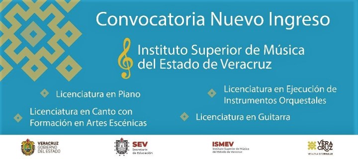 Xalapa, Ver., 07 de abril de 2019.- El Instituto Superior de Música del Estado de Veracruz (ISMEV) abrió la convocatoria para el Ciclo Previo dirigido a jóvenes de 13 a 17 años, así como a las licenciaturas en Canto con Formación en Artes Escénicas, Ejecución de Instrumentos Orquestales, en Piano y en Guitarra.