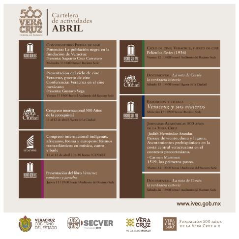 A partir del mes de abril y hasta el mes de diciembre de este año, el Ex Convento Betlehemita, en el puerto de Veracruz, y la Galería de Arte Contemporáneo, en Xalapa, recibirán a ponentes que inducirán a la reflexión al público, a fin de generar una experiencia enriquecedora en cuanto a perspectivas históricas en torno al proceso conmemorativo por los 500 años de la irrupción española y el inicio del proceso fundacional de la Nueva España.