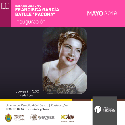 Xalapa, Ver., 01 de mayo de 2019.- El Instituto Veracruzano de la Cultura (IVEC) inaugurará, este jueves, a las 9:30 horas, la Sala de Lectura Francisca García Batlle “Pacona”, en la Casa de Cultura de Coatepec, con el fin de promover y fomentar la lectura en niñas y niños, jóvenes y adultos.