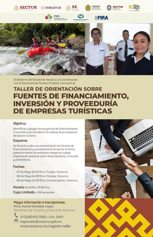 Xalapa, Ver., 02 de mayo de 2019.- Con la finalidad de establecer puentes entre la iniciativa privada y las fuentes de financiamiento e inversión, la Secretaría de Turismo y Cultura (SECTUR) realizará del 07 al 09 de mayo el “Taller de Orientación sobre fuentes de financiamiento, inversión y proveeduría de empresas turísticas”.