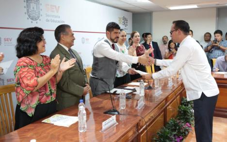 Xalapa, Ver., 09 de mayo de 2019.- El titular de la Secretaría de Educación de Veracruz (SEV), Zenyazen Escobar García, entregó nombramientos y dio la bienvenida al Consejo Interinstitucional Veracruzano de Educación (CIVE) a 12 presidentes de comisiones, seis vicepresidentes y 12 comisionados, comprometidos con una reconversión educativa de fondo y sin simulación.