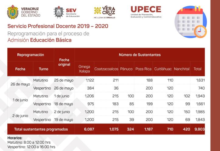 Xalapa, Ver., 22 de mayo de 2019.- La Secretaría de Educación de Veracruz (SEV), a través de la Unidad de Planeación, Evaluación y Control Educativo (UPECE), informa a los sustentantes para el Concurso de Admisión Educación Básica 2019-2020 que, con base en las nuevas disposiciones de la Coordinación Nacional del Servicio Profesional Docente (CNSPD), el proceso de admisión al servicio educativo en Educación Básica fue reprogramado para los días 25 y 26 de mayo; así como 01 y 02 de junio.
