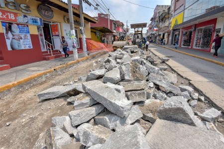 Xalapa, Ver., 23 de mayo de 2019.- Con la inversión de 1.5 millones de pesos se lleva a cabo la rehabilitación parcial de una parte de la calle Francisco Javier Clavijero, en el centro de la ciudad, donde varias placas de concreto están fracturadas debido al impacto del transporte público u obras de drenaje y alcantarillado posteriores a su pavimentación.