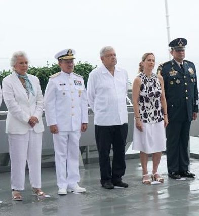 Navegando en aguas del Golfo de México, frente al cuatro veces heroico puerto de Veracruz, acompañado por el Almirante-Secretario José Rafael Ojeda Durán, el General-Secretario Luis C. Sandoval González, la titular de la Segob, Olga Sánchez Cordero, el de la SCT, Javier Jiménez Espriú y el gobernador Cuitláhuac García, el Presidente conmemoró el 102 aniversario de la Marina Nacional, por lo que consideró este día como “histórico”.