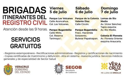 Xalapa, Ver., 02 de julio de 2019.- A partir de este viernes y hasta el domingo, las Brigadas Itinerantes del Registro Civil, implementadas por la Secretaría de Gobierno (SEGOB), brindarán atención totalmente gratuita a ciudadanos nacidos en la entidad y que vivan en la zona conurbada Veracruz-Boca del Río.