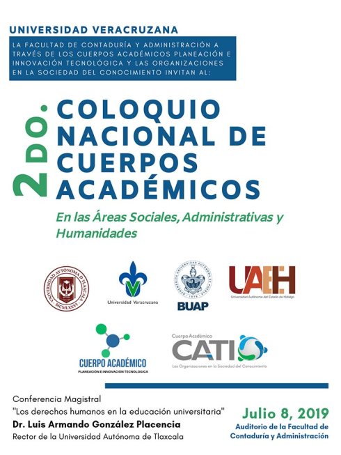 Xalapa, Ver., 03 de julio de 2019.- La Facultad de Contaduría y Administración (FCA) de la Universidad Veracruzana (UV) será sede del Segundo Coloquio Nacional de Cuerpos Académicos en las Áreas Sociales, Administrativas y Humanidades, que tendrá como sede el auditorio de esa entidad académica el próximo lunes 8 de julio.