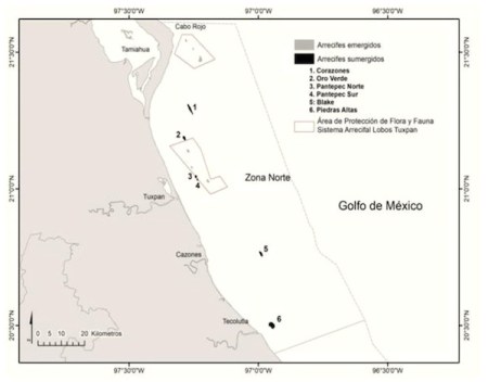Los arrecifes localizados son: Corazones, Oro Verde, Pantepec Norte, Pantepec Sur, Piedras Altas, Camaronera y Los gallos. Corazones es el arrecife coralino sumergido más largo y septentrional reportado, se encuentra ubicado frente a la laguna de Tamiahua, con una longitud cercana a los cinco kilómetros y un ancho de 700 metros.