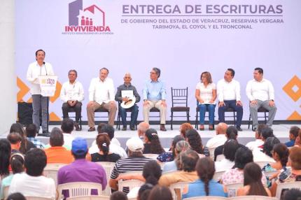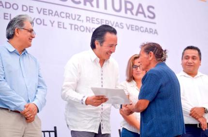 Boca del Río, Ver., 15 de julio de 2019.- Para avanzar en la regularización de la tierra y que más familias tengan garantía plena y certeza jurídica sobre sus propiedades, el gobernador Cuitláhuac García Jiménez entregó escrituras a habitantes de las reservas Vergara Tarimoya, El Coyol y El Tronconal.