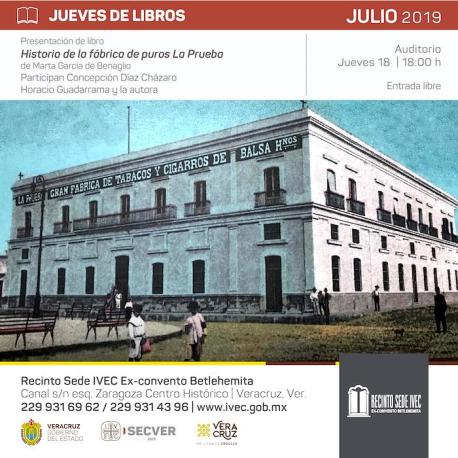 Xalapa, Ver., 17 de julio de 2019.- Como parte del programa Jueves de Libros, el Instituto Veracruzano de la Cultura (IVEC) presenta “Historia de la Fábrica de Puros La Prueba”, de Marta García de Benaglio. La cita es este 18 de julio a las 18:00 horas en el Recinto Sede Ex Convento Betlehemita. La entrada es libre.