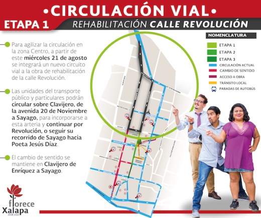 Quienes transiten por Clavijero, de la avenida Manuel Ávila Camacho hacia 20 de Noviembre, también podrán circular por Sayago para continuar por Revolución, mientras que la calle Doctor Rafael Lucio mantiene su sentido de circulación original, por lo que las unidades de transporte público que van de 20 de Noviembre con destino a Enríquez, Úrsulo Galván o Hidalgo utilizarán esta vialidad.