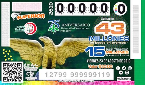 Xalapa, Ver., 20 de agosto de 2019.- La Lotería Nacional para la Asistencia Pública (Lotenal) dedicó el billete del Sorteo Superior 2610 al 75 aniversario de fundación de la Universidad Veracruzana (UV), institución educativa que festeja este acontecimiento con una variada oferta de eventos artísticos y culturales durante todo 2019.