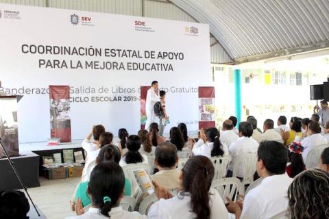 Tantoyuca, Ver., 23 de agosto de 2019.- La Secretaría de Educación de Veracruz (SEV) repartirá 9 millones 890 mil 87 libros de texto gratuitos para el Ciclo Escolar 2019-2020. En la primaria “Juan León Herrera”, de este municipio, autoridades educativas y de la Secretaría de la Defensa Nacional (SEDENA) dieron el banderazo de inicio.