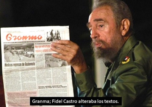 Manipulación pura, pues; construcción mediática de la realidad según conviniera al comandante Fidel. Una era la realidad que se vivía en la isla y otra la que proyectaba en el periódico oficial, del cual había una edición internacional, que se enviaba a otros países y en la que se pintaba a Cuba como un paraíso (yo de joven viví deslumbrado por lo que leía y se decía).