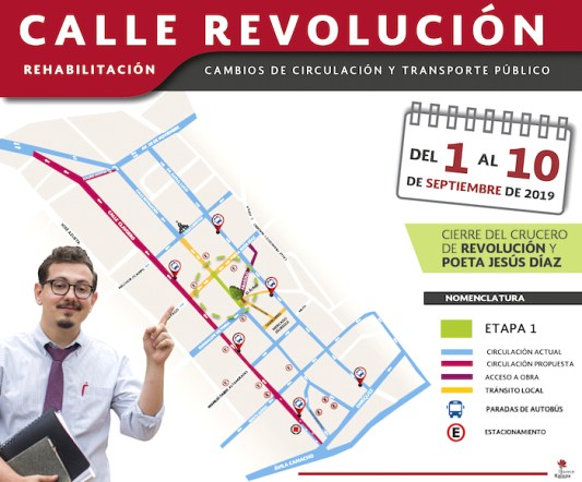 Xalapa, Ver., 30 de agosto de 2019.- Por las obras de rehabilitación integral de la calle Revolución, a partir de este domingo a las 08:00 horas se cerrará a la circulación vial el cruce de las calles Sayago, Revolución y Poeta Jesús Díaz. En Clavijero se podrá circular desde Enríquez hasta Isauro Acosta para incorporarse a la avenida 20 de Noviembre.