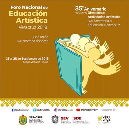 Xalapa, Ver., 10 de septiembre de 2019.- La Secretaría de Educación de Veracruz (SEV), a través de la Dirección de Actividades Artísticas, invita al Foro Nacional de Educación Artística Veracruz 2019, que se realizará del 25 al 28 de septiembre en esta ciudad, con cupo limitado.