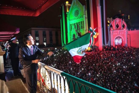 En la hora señalada apareció el gobernador Cuitláhuac García Jiménez para dar su primer grito de independencia; entre aplausos y gritos de alegría fue recibido por los presentes.