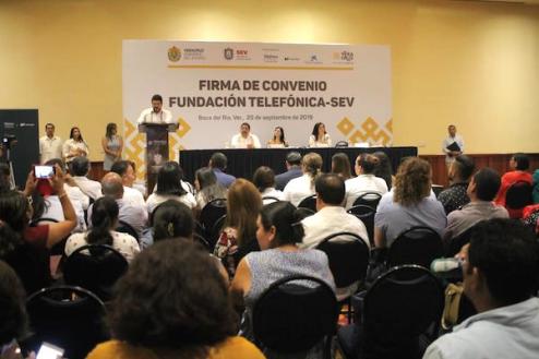 Boca del Río, Ver., 20 de septiembre de 2019.- La Secretaría de Educación de Veracruz (SEV) y la Fundación Telefónica México signaron un convenio para impulsar el programa «Comprometidos con la Educación», con la finalidad de que las tecnologías digitales enriquezcan el proceso de enseñanza-aprendizaje en escuelas de nivel básico de la entidad. En una primera etapa beneficiará a 20 escuelas multigrado y 10 regulares.