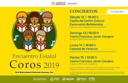 Veracruz, Ver., 07 de octubre de 2019.- El Instituto Veracruzano de la Cultura (IVEC), a través de la Subdirección de Educación e Investigación Artística, realizará el Encuentro Estatal de Coros 2019, del 12 al 15 de octubre, a partir de las 19:00 horas y con entrada libre en el Exconvento Betlehemita, el Teatro Francisco Javier Clavijero y la Catedral de Veracruz.