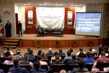 Acompañado por la diputada presidenta de la Comisión de Gobernación, Adriana Paola Linares Capitanachi, inauguró el foro organizado por el Gobierno Municipal y el Congreso del Estado La actuación policial en la implementación del uso legítimo de la fuerza, en el auditorio “Sebastián Lerdo de Tejada”.