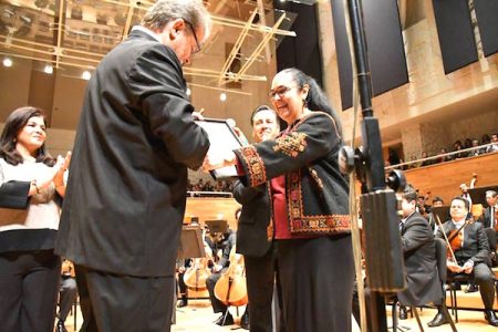 En Tlaqná, Centro Cultural, la rectora Sara Ladrón de Guevara entregó un reconocimiento a Lanfranco Marcelletti, por su invaluable labor al frente de la OSX y su contribución al prestigio de esta casa de estudios