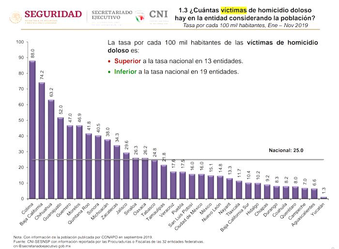 Xalapa, Ver., 17 de diciembre de 2019.- Al cierre de este año y de acuerdo con el Secretariado Ejecutivo del Sistema Nacional de Seguridad Pública (SESNSP), con corte al 30 de noviembre, Veracruz se ubica por debajo de la media nacional en cuanto a homicidios dolosos, registrando 17.6 por ciento.