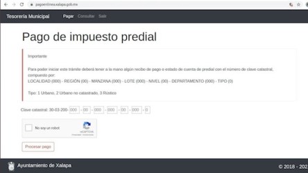 La jefa del Departamento de Recaudación, Sandra Romero Olvera, explicó que al ingresar a la página pagoenlinea.xalapa.gob.mx inmediatamente se solicita la clave catastral, que consta de 16 números, a los que se debe añadir un último dígito que corresponde al tipo de predio y que aparece en el recibo: “Uno, cuando es urbano; dos, urbano no catastrado, y tres, rústico”.