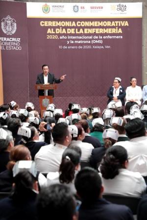 Xalapa, Ver., 10 de enero de 2020.- Por la entereza con la que trabajan diariamente, entregando vida, corazón y alma, el gobernador Cuitláhuac García Jiménez reconoció este día a las enfermeras y enfermeros de Veracruz, al tiempo que garantizó que con el Instituto de Salud para el Bienestar (INSABI) será posible subsanar las deficiencias.