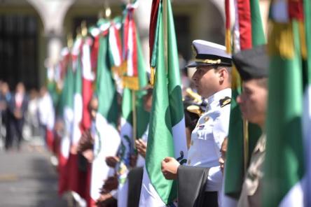 Acompañado por mandos militares y navales, integrantes del gabinete y presientes de los Poderes Legislativo y Judicial, señaló que los gobiernos de la Cuarta Transformación tienen muy claro el significado del lábaro patrio, al mantenerse en la línea del servicio a la nación.