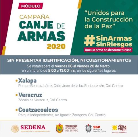 Xalapa, Ver., 02 de marzo de 2020.- A fin de contribuir a la disminución de la violencia, prevenir delitos y evitar accidentes, las secretarías de Seguridad Pública (SSP) y de la Defensa Nacional (SEDENA) realizarán la primera campaña estatal “Sin Armas, Sin Riesgos”, del 06 al 20 de marzo en Xalapa, Veracruz y Coatzacoalcos.