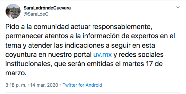 Xalapa, Ver., 14 de marzo de 2020.- Derivado del anuncio que realizo la Secretaría de Educación Pública y la Secretaria de Salud, respecto a la ampliación del próximo receso escolar de semana santa; la rectora de la Universidad Veracruzana, Sara Ladrón de Guevara, a través de sus redes sociales anuncio nuevas medidas que la Casa de Estudios tomará en concordancia con las anunciadas por la autoridad federal.