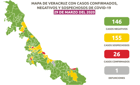 La cifra de positivos es 26: 13 en Boca del Río, cinco en Veracruz, tres en Poza Rica, uno en Ixtaczoquitlán, Fortín, Xalapa, Coatzacoalcos y Tlacotalpan; sobre este último informamos de su fallecimiento por COVID-19. En tanto que permanecen en seguimiento 342 contactos declarados, incluidos los casos positivos.